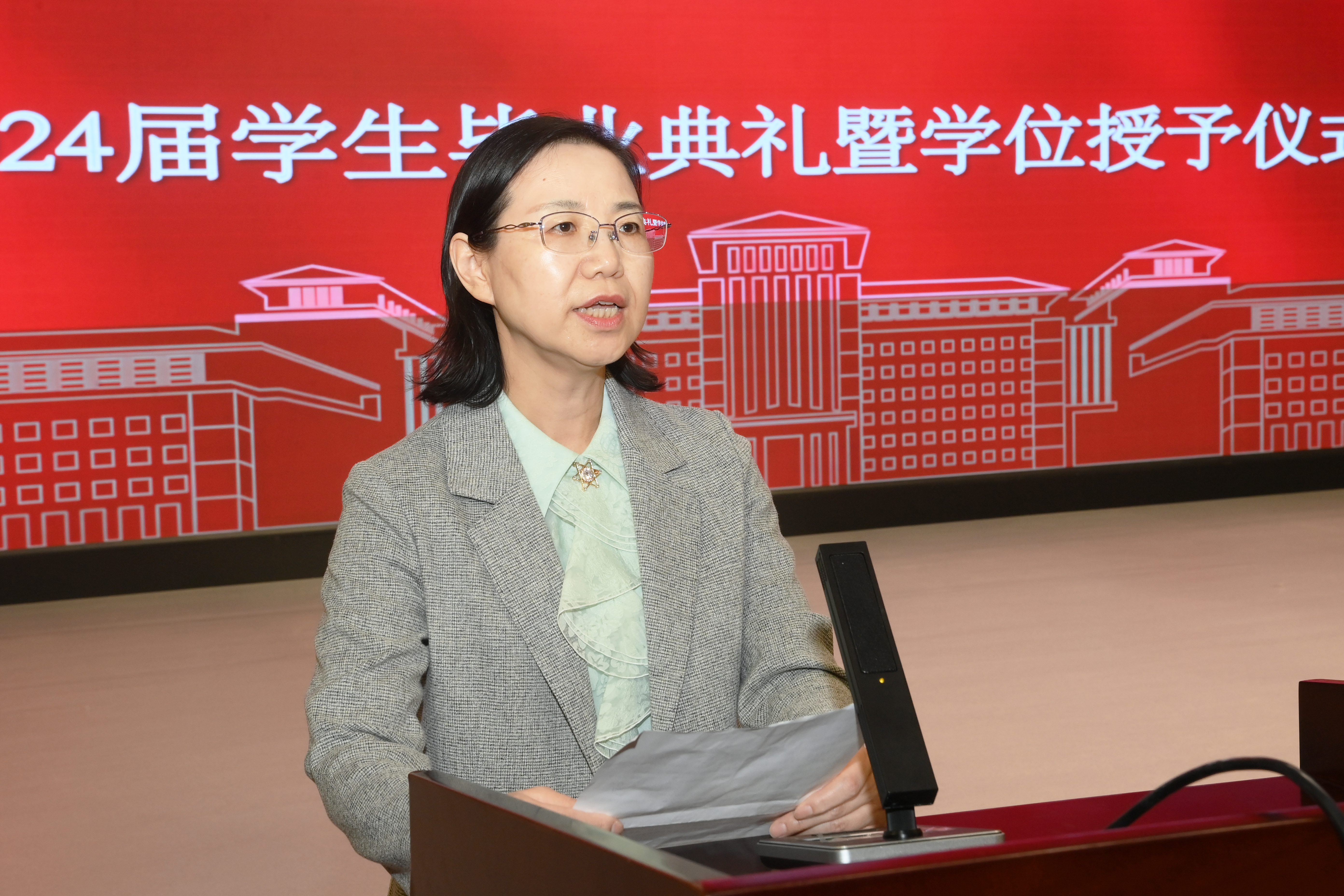 的先贤已经做出了榜样,那就是“向北精神”。随后,孙晓颖院长结合“向北精神”和学院的红色传承,勉励同学们一定要牢记自己肩负的责任和使命,努力为国家多做贡献。在面对机遇时要敢于去尝试、去探索、去突破,遇到困难时要不退缩、不放弃、不自怜。以一颗乐观的心、宽容的心、感恩的心面对生活,不以朝夕说成败,而以长远论英雄。最后,孙院长祝福所有的2024届同学们前程似锦、一帆风顺!