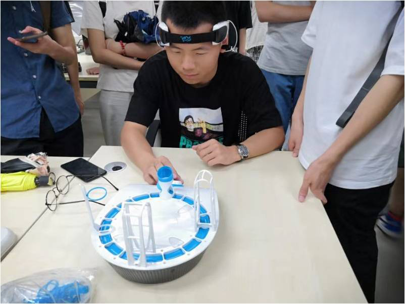 Mr. Wan Feng from the Department of Electrical and Computer Engineering helped the delegation cultivate a more intuitive understanding of the scientific research projects by showing three authentic experiments. The first experiment was the concentration training project, in which different concentration levels were regulated to control the wind power of different frequencies to drive the balls over obstacles. The second experiment was to have the subjects control alpha waves below a threshold to control the movement of insects. The third experiment revolved around observing the waves of the same frequency in the brain generated by two strobe squares of different frequencies and after obtaining these waves with an instrument, controlling the car to move back and forth with algorithms.
