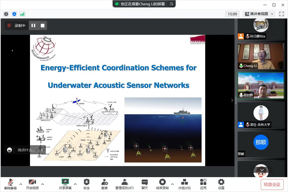 Professor Cheng Li then summarized the characteristics of underwater acoustic channels, such as spatiotemporal differences, large propagation delays, bandwidth limitations, and severe multipath effects. He also explained the design of two wake-up mechanisms and the simulation experimental results for our teachers and students. Aiming at the balance between robustness and energy consumption in UWSNs networks, the mathematical formula of network robustness is given. At the same time, the selection scheme of relay node to extend the life of the network is introduced. Finally, for the last aspect of this part, the collaborative scheme of using AUV for data collection, Professor Li concluded that the path planning of AUV has a key impact on the data acquisition and sleep duration of nodes.
