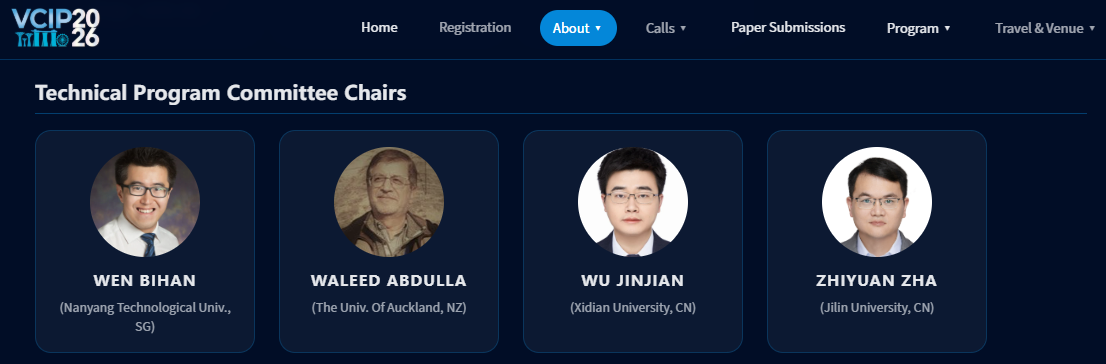 查志远教授当选2026年国际视觉信号处理与通信领域旗舰会议IEEE International Conference on Visual Communications and Image Processing(VCIP)程序委员会主席(Technical Program Committee Chair)。该会议将于2026年12月13–16日在新加坡举行(官网://vcip-2026.org/)。自1986年以来,该会议一直展示视觉信号处理与通信领域的开创性基础和应用研究工作,为来自全球学术界和工业界的研究人员、工程师和专业人士提供了一个富有成果的交流平台。